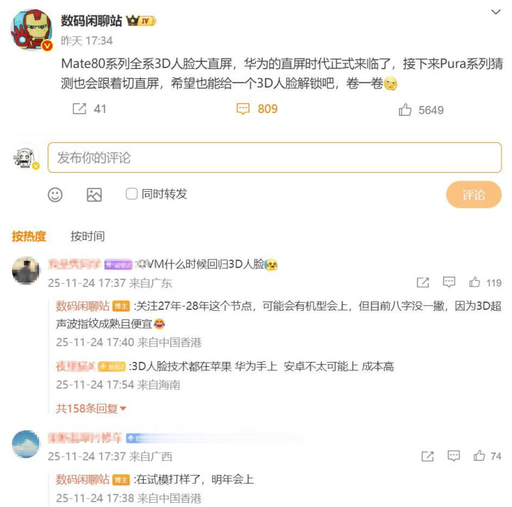 再加上华为的上游供应商只提供传感器和模组,算法系统都是华为自己调试的,这个自研算法已经在Mate80系列上用了,全版本都有3D人脸识别,如果Pura 90系列真的引入了这个功能,竞争力会大大提升。