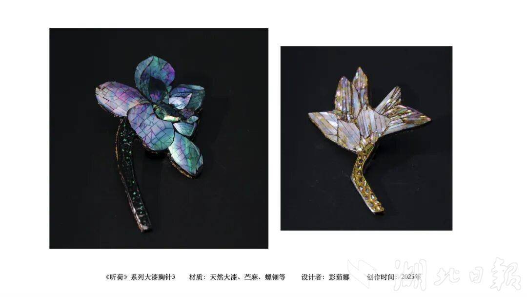 走进彭茹娜的创作世界,传统大漆工艺与现代审美碰撞出别样火花。2025年创作的《听荷》系列大漆胸针,融合传统工笔花鸟画的东方意境,以天然大漆为基底,搭配苎麻、蛋壳、螺钿、欧泊等多元材质,或勾勒荷韵清雅,或点缀珠光灵动,三件作品各有韵味,将中式美学藏于方寸之间。