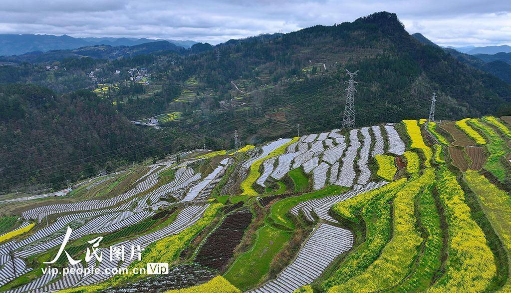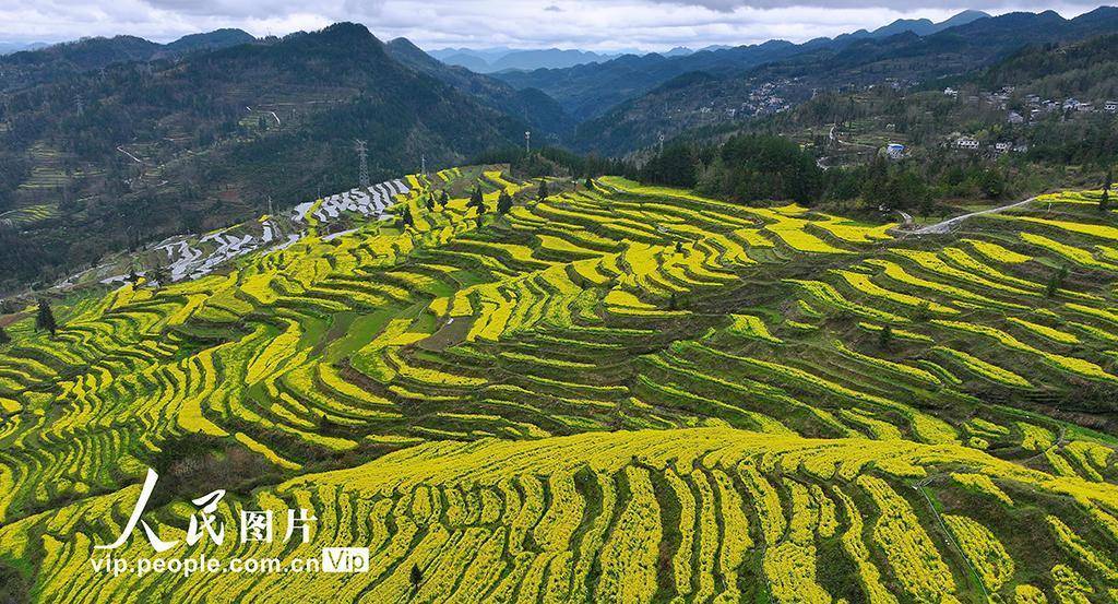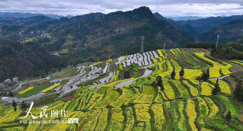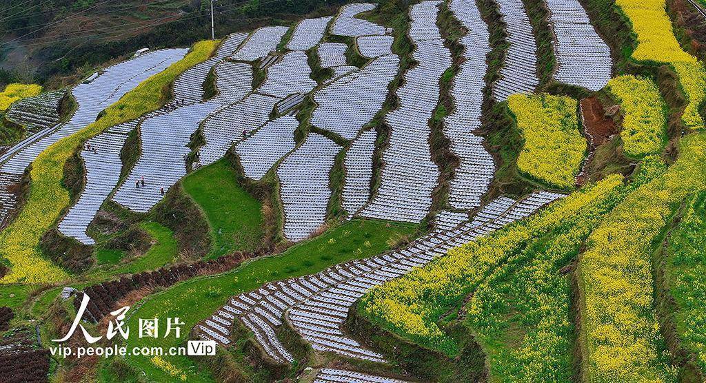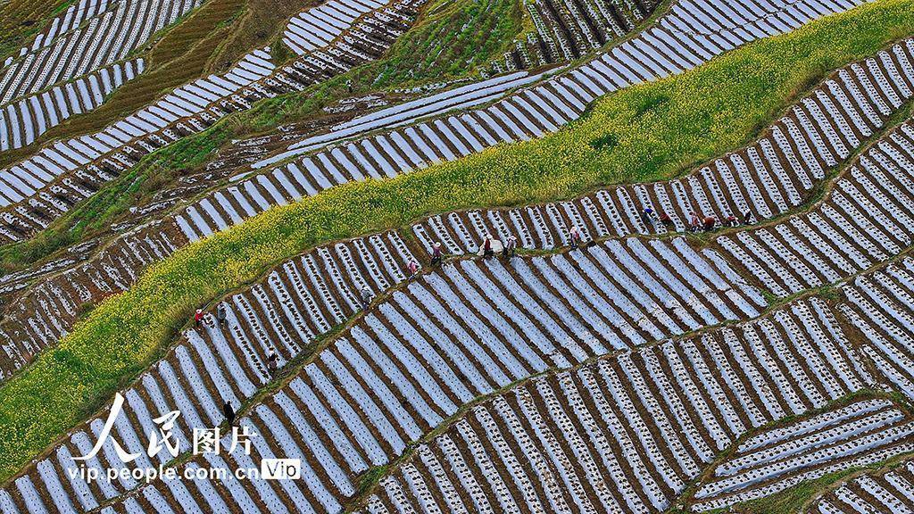 2026年3月24日,在重庆酉阳土家族苗族自治县丁市镇中坝村千氹田梯田,村民们正在移栽菊花。田野中盛开的油菜花、劳作的村民与梯田的优美线条相映成景,绘就一幅生动的春耕图。段成军摄(人民图片网)